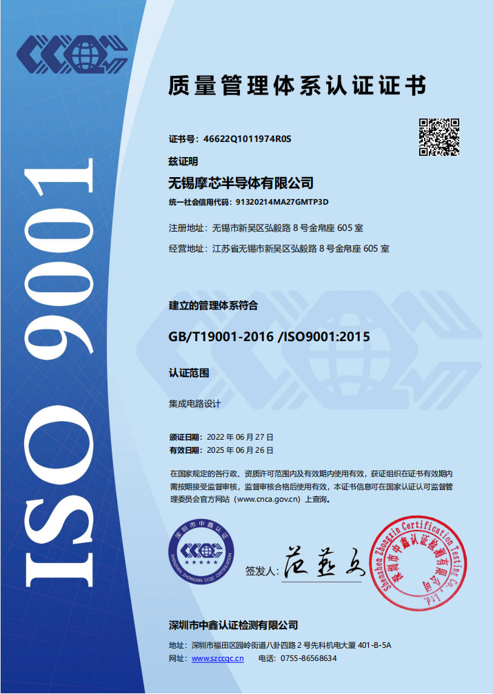 近日,无锡摩芯半导体正式通过ISO 9001:2015质量管理体系认证审核,标志着我司已达到国际质量水平,并步入规范化、标准化、科学化的现代企业管理轨道。